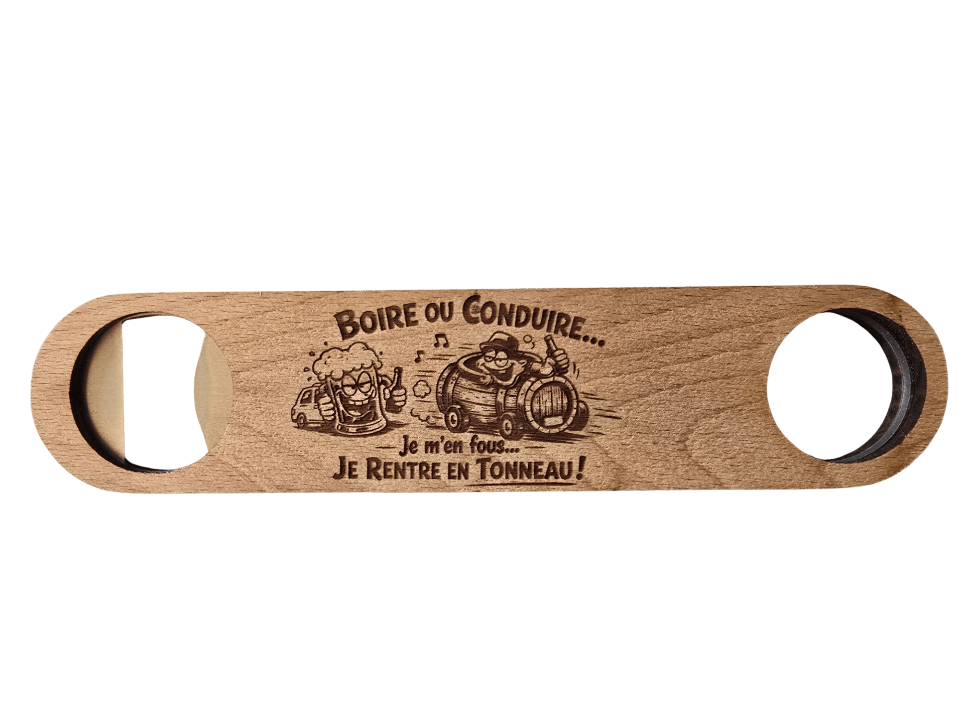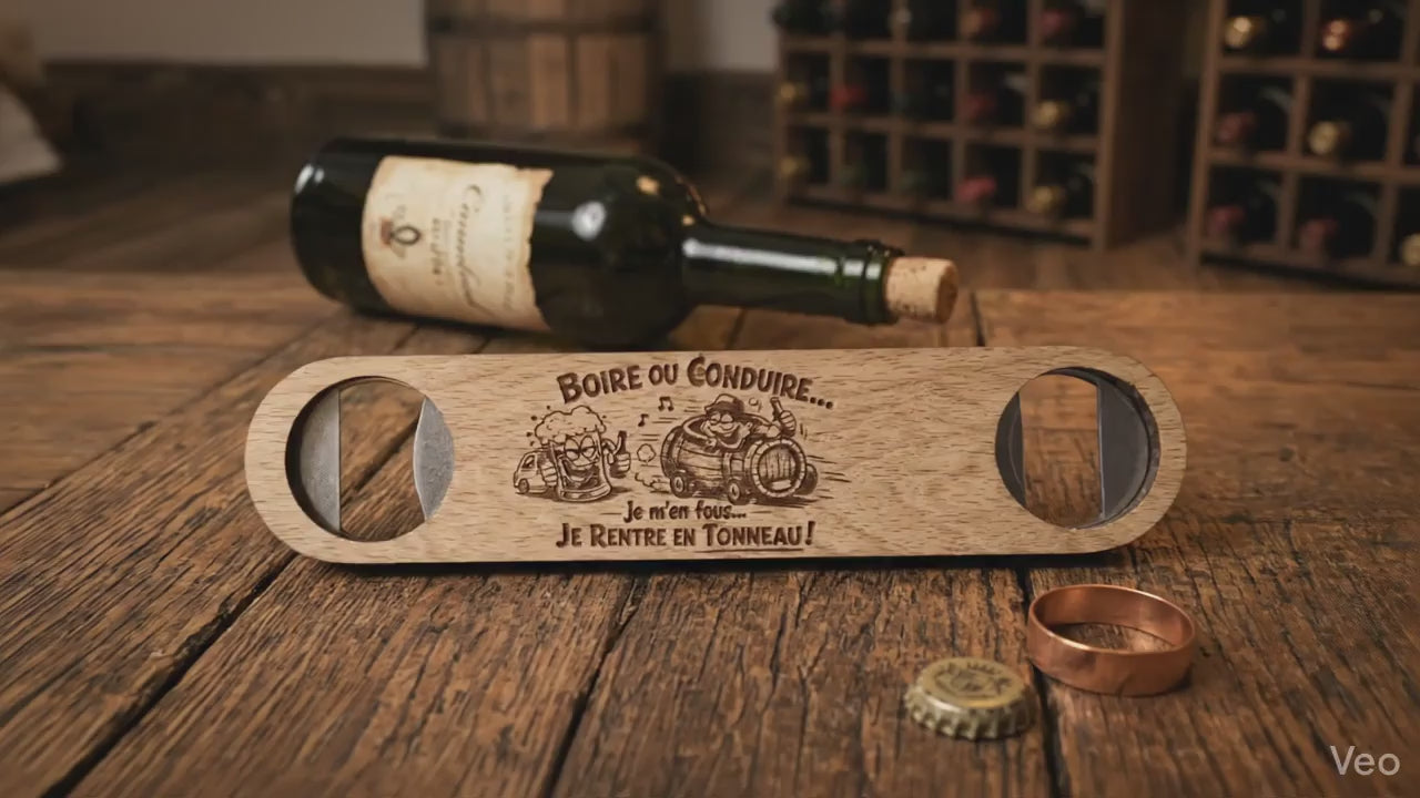 Décapsuleur en bois de hêtre gravé au laser – Message humoristique recto/verso personnalisable
